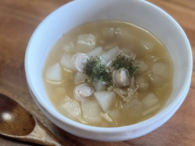 2.鍋に水、桜島大根、えのき茸、ウィンナー、コンソメを入れて蓋をし
